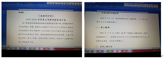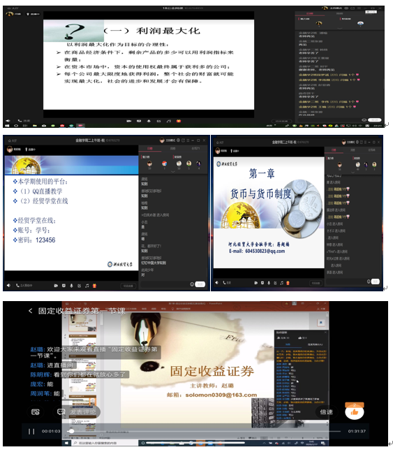 通过学习,老师们基本掌握了远程教学的技术和方法,切实提高了自身信息化水平和在线教学能力,自2月17日开始,永利3044集团官网教师陆续展开各类在线课程平台教学、直播教学以及混合式等多种教学方式。如闫福教授的《公司金融》通过开通QQ直播间授课,蒋超楠老师的《金融学》采用经贸学堂在线与QQ直播混合的教学模式,李建英教授的《投资项目评估与管理》课程采用中国大学MOOC平台与QQ视频相结合的模式,王风华老师的《银行实务》课程采用在线辅导+智盛智慧金融平台,还有赵璐老师的《固定收益证券》采用钉钉直播模式等等,每一位老师根据课程特点选择合适的平台,采用多样化的授课形式。