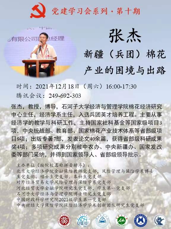 12月18日下午,公司研究生党支部、员工第一党支部和北京大学经济公司金融保险教师党支部、风险管理与保险学系博士生党支部、硕士生党支部、本科生党支部,对外经济贸易大学风险管理与保险学系党支部,石河子大学经济与管理公司博士研究生党支部、中国财政科公司2021级博士研究生党支部,中央财经大学保险公司保险经济学学术创新团队党支部共同开展了支部共建活动,活动主题为“新疆(兵团)棉花产业的困境与出路”。本次学习活动采取线上腾讯会议的形式进行,六所高公司党员代表100余人参加。