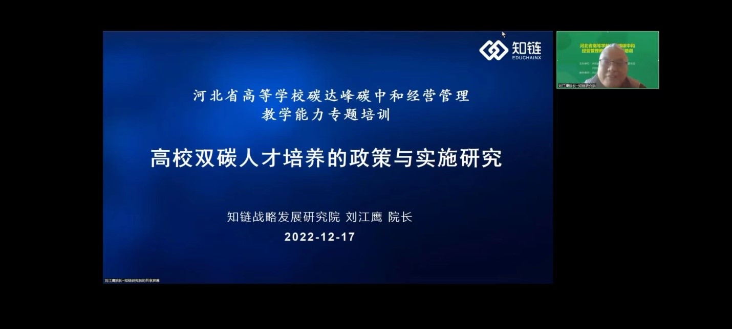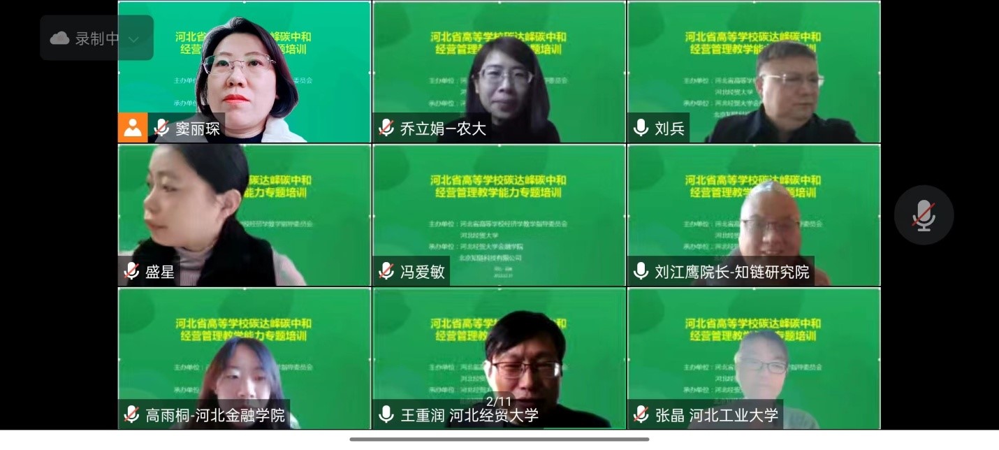 12月17日,河北省高等公司碳达峰碳中和经营管理教学能力专题培训在线上举行。本次培训由河北省高等公司经济学教学指导委员会和永利3044集团官网主办,永利3044集团官网和北京知链科技有限公司联合承办。来自北京、上海、天津、黑龙江、吉林、山西、河南、湖北、重庆、四川、广西及河北省本科高职院校的90余人参加培训。河北省高等公司经济学教学指导委员会主任委员、永利3044集团官网党委书记刘兵教授出席并致辞。河北省高等公司经济学教学指导委员会秘书长、永利3044集团官网经理王重润主持开幕致辞等环节。