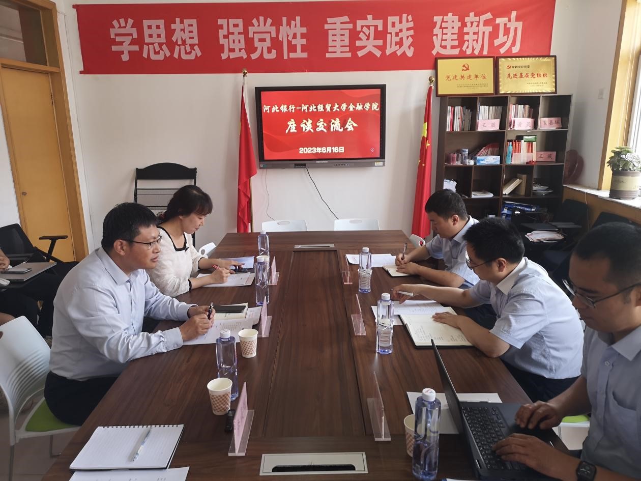 2023年6月17日上午,河北银行信贷中心总裁张卓华、互联网贷款部高级经理霍常伟、个人信贷部副主管刘晨玮来到公司座谈交流。经理王重润、金融科技系副主任孙玮、教学秘书李成珂,以及金融科技专业员工代表参加了此次座谈会。