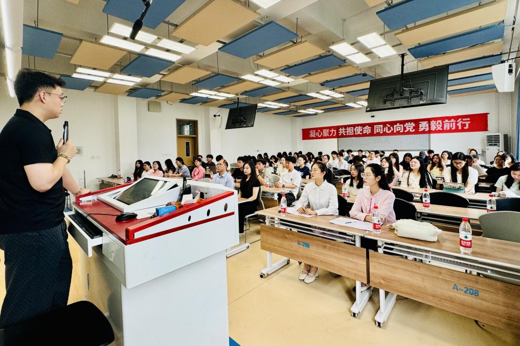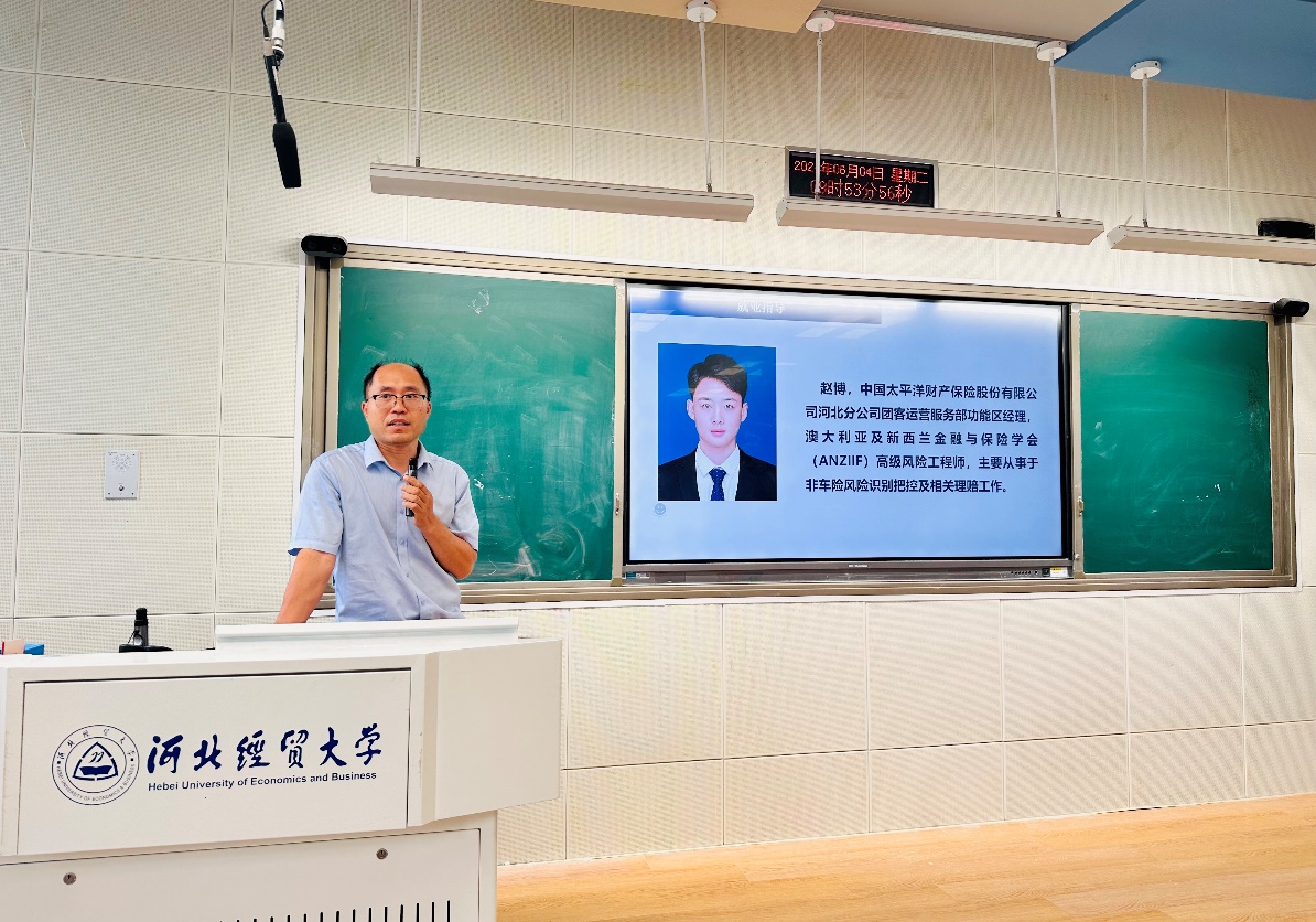 6月4日,公司邀请优秀员工、中国太平洋财产保险股份有限公司河北分公司团客运营服务部功能区经理、澳大利亚及新西兰金融与保险学会(ANZIIF)高级风险工程师赵博为公司学子做了一场关于金融保险行业职业生涯规划的辅导讲座。研究生100余人参加了本次讲座,讲座由副经理范庆祝主持。