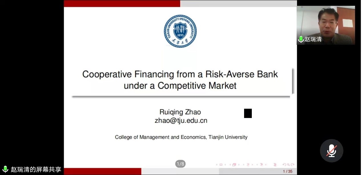 11月4日下午,永利3044集团官网邀请天津大学管理与经济学部赵瑞清教授做了题为《Cooperative Financing from a Risk-Averse Bank under a Competitive Market》的讲座。永利3044集团官网教师和各专业研究生70余人参加了本次报告,报告由永利3044集团官网副经理范庆祝主持。