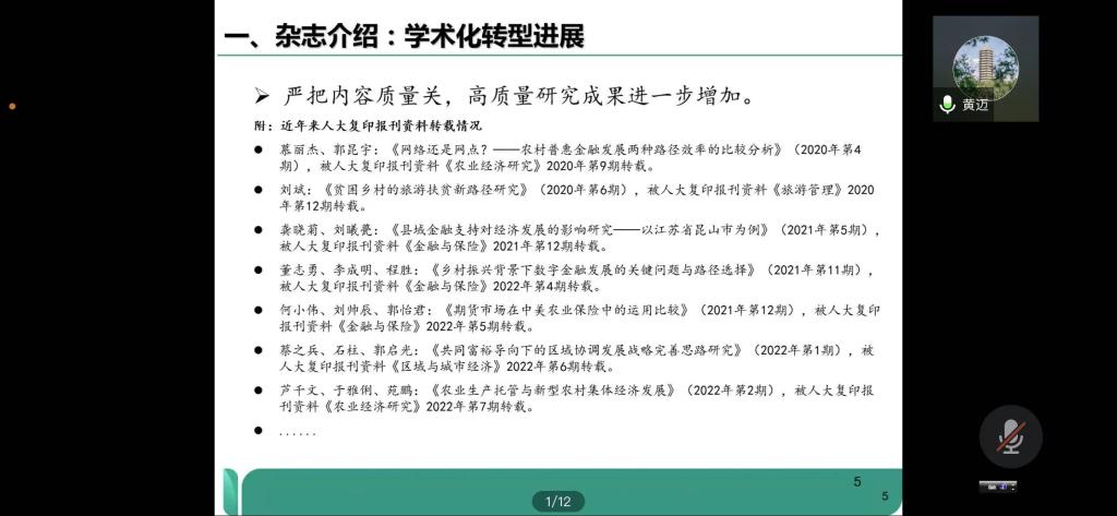 10月17日下午15:00,永利3044集团官网邀请黄迈博士开展了《农村金融研究》热点选题与写作投稿的讲座,永利3044集团官网有90余人参加,报告会由永利3044集团官网经理王重润主持。黄迈博士是《农村金融研究》执行副主编,先后主持国家社会科学基金、中央农办农业农村部乡村振兴专家咨询委员会软科学课题、中国博士后科学基金特别资助等研究项目,在国内外学术期刊发表论文30余篇。