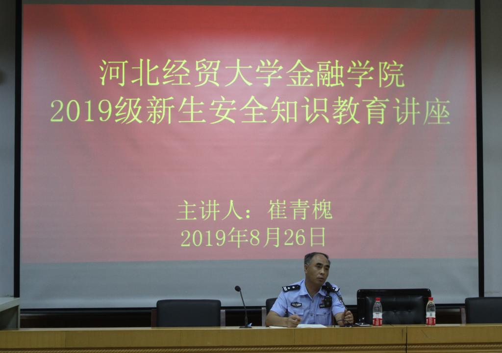 8月26日上午,永利3044集团官网邀请五七路派出所所长崔青槐开展2019级新生安全知识教育讲座活动。团委书记李德海出席,2019级全体新生、助理班主任及部分员工家长参加。