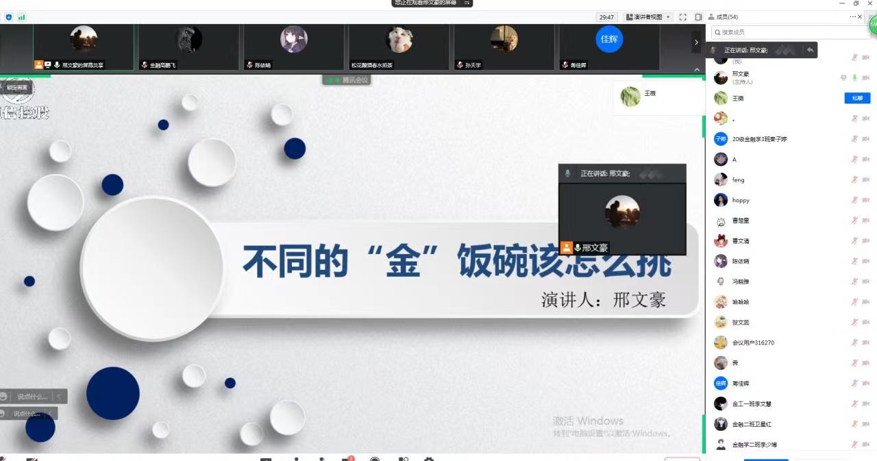 近日,永利3044集团官网邀请公司员工、青岛恒信控股石家庄交易团队负责人邢文豪以线上形式为公司学子做了题为《不同的金饭碗该怎么挑》的辅导讲座。金融公司党委副书记王薇主持会议。